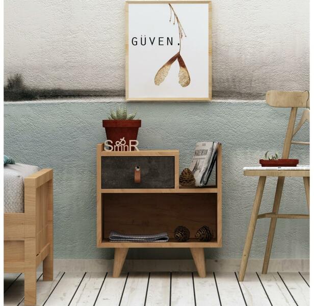 Éjjeliszekrény a kéznél lévő dolgok tárolására. Egyszerű, modern stílusának köszönhetően bármilyen otthonba illik. Barna/szürke színösszeállítás. Laminált forgácslapból készült. Alapanyag vastagsága: 1,8 cm. Bőrből készült fogantyú. Asztallábak magassága: 12 cm. Fa mintázata: tölgy.