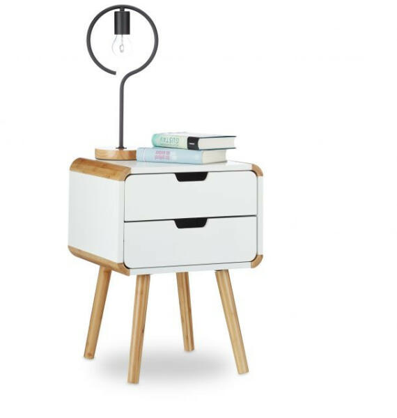Skandináv design éjjeliszekrény 2 fiókkal Figyelemfelkeltő a hálószobában, skandináv design natúrfa szín és világos fehér keveréke Stílusos éjjeliszekrény 2 kihúzható fiókkal Éjjeliszekrény mérete és anyaga Méret: 55 x 40 x 40 cm Fiók: 5 x 36 x 36 cm Azsztalláb magasság: 27 cm Teherbírás: max 15 kg-ig terhelhető Súly: 10 kg Anyag: bambusz és MDF Szín: natúr és