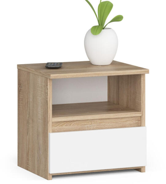 Modern és praktikus éjjeliszekrény egy fiókkal és nyitott tárolórésszel, amely tökéletes kiegészítője lehet hálószobájának. Sonoma tölgy és fehér színkombinációban, tartós laminált lapból készült, ABS élzárással a hosszú élettartam érdekében. Elegáns és praktikus tárolási megoldás a hálószobábaAz AKORD CL1 éjjeliszekrény tökéletes kombinációja a fun