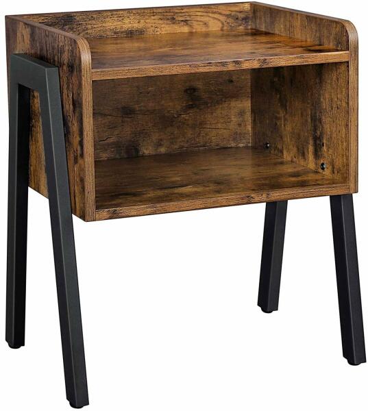 éjjeliszekrény, egymásra rakható oldalsó asztal nyitott rekesszel, éjjeliszekrény, végasztal, ipari ékezetes bútor acél lábakkal, rusztikus barna és fekete: BÁJ OS VINTAGE ELEGANCIA : A modern bútortrendek és a vintage egyesülnek a végasztalunk dizájnjában. Enyhén rusztikus, de egyben lenyűgözően leegyszerűsített darab is a régi világ báj és elegancia esszenciáját t