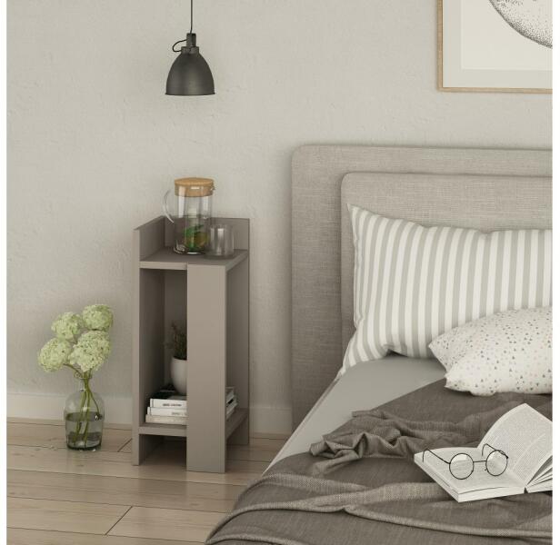 Éjjeliszekrény szürke színben. Egyszerű, modern stílusának köszönhetően bármilyen otthonba illik. Alkalmas az ágy bal oldalára. Laminált forgácslapból készült. Két polcszint, ahová elteheti azokat a dolgokat, amelyeket kéznél szeretne tartani. Az anyagvastagság: 1,8 cm.
