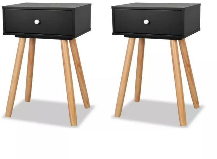 Színe: fekete és barna Anyaga: tömör fenyőfa lábak + MDF váz Méretek: 40 x 30 x 61 cm (Ho x Szé x Ma) Egy fiókkal Könnyen összeszerelhető A szett 2 éjjeliszekrényt tartalmaz