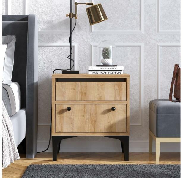 ORABELLA éjjeliszekrény. Egyszerű, modern stílusának köszönhetően bármilyen otthonba illik. Tágas fiók és szekrény a kéznél lévő dolgok tárolására. A fa és a fekete szín kombinációja. Laminált forgácslapból, műanyag lábakkal. Az anyag vastagsága: 1,8 cm. A lábak hossza: 16 cm. Fa mintázata: tölgy.