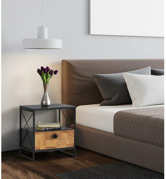 Éjjeliszekrény. Egyszerű, modern stílusának köszönhetően bármilyen otthonba illik. Szekrény és polc a kéznél lévő dolgok tárolására. A fa és a fekete szín kombinációja. Laminált forgácslapból készült, a keret fémből készült. Az anyag vastagsága: 1,8 cm. A lábak hossza: 8 cm.