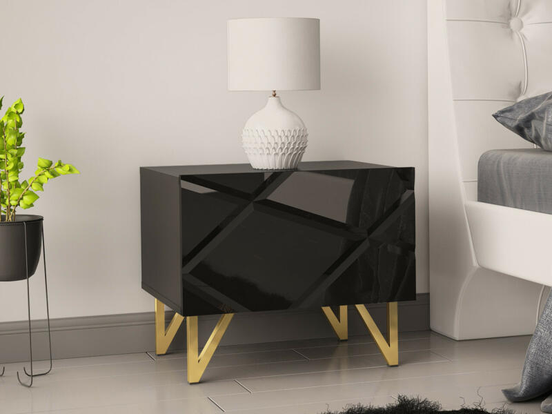 Éjjeliszekrény. Egyszerű, modern stílusának köszönhetően bármilyen otthonba illeszkedik. Két tágas fiókban tárolhatja azokat a dolgokat, amelyeket kéznél szeretne tartani. Elegáns megjelenés a márvány dekorációnak köszönhetően. A fehér szín és az aranyszínű fém kombinációja. Laminált forgácslapból készült, a lábak és a keret fémből készült. Az anyagvastag