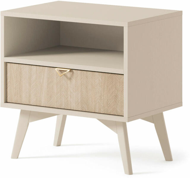 A Forest éjjeliszekrény egy elegáns kiegészítő minden hálószobába, amely egyedi karaktert ad minden szobának. A 16 mm vastag laminált bútorlap biztosítja az ellenálló képességét. Gyönyörű bézs színben készül, amelynek köszönhetően harmonikus atmoszférát teremt majd. A küllemét emeli még a szép halszálka minta is. Az éjjeliszekrény egy nyitott polccal és egy fi