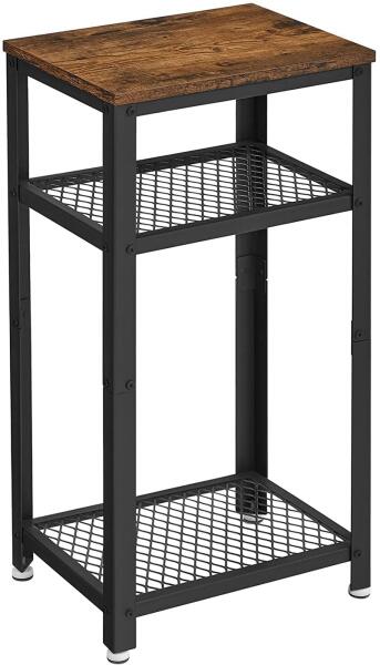 folyosói oldalsó asztal, éjjeliszekrény 2 hálós polccal, végasztal, irodai folyosón vagy nappaliban, stabil acélkeret, rusztikus barna Gyöny örű és funkcionális dizájn: A fa erezetű felsőrész és az acélváz kombinációja nyugodt és érett légkört teremt Vintage stílusú asztallap: A felső tábla antik textúrájú, amely akár 10 kg-ig is ellenáll, és festék helyett ny