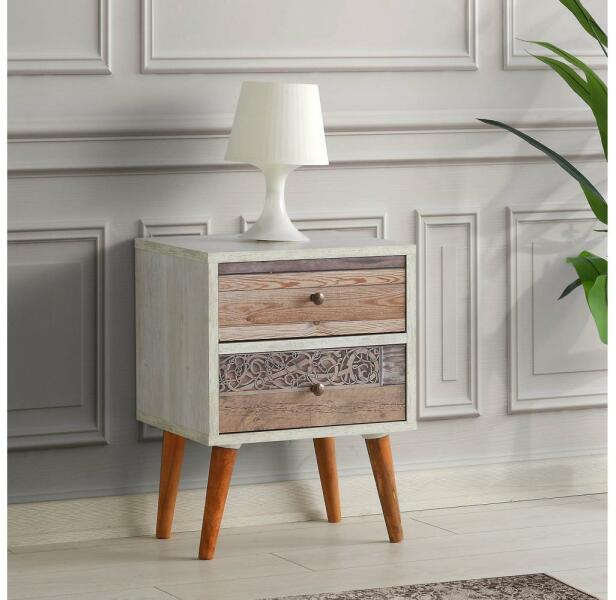 Vintage stílusú éjjeliszekrény. Egyszerű, modern stílusának köszönhetően bármilyen otthonba illik. Két tágas fiókban tárolhatja azokat a dolgokat, amelyeket kéznél szeretne tartani. Naturális színekben tervezték. Laminált forgácslapból készült. Az anyagvastagság: 1,8 cm. A lábak hossza: 21 cm. Fa mintázata: diófa.