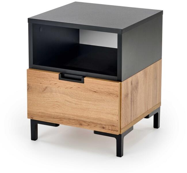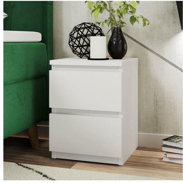 Éjjeliszekrény. Egyszerű, modern stílusával minden otthonba illik. Két tágas fiókban tárolhatja azokat a dolgokat, amelyeket kéznél szeretne tartani. 16 mm vastag laminált lemezből készült. Ez a bútordarab szétszedve érkezik.