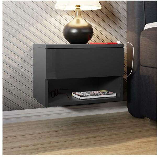 Éjjeliszekrény falra szerelhető. Egyszerű, modern stílusának köszönhetően bármilyen otthonba illik. Polc és fiók a kéznél lévő dolgok tárolására. Vastag laminált lemezből készült, 16 mm vastagságban. Fényes elülső részek, fogantyúk nélkül. Ez a bútordarab szétszedve érkezik.