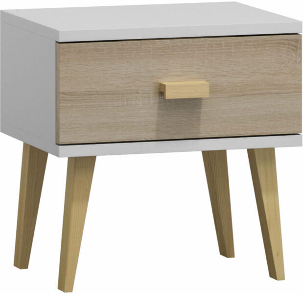 A fenyőfából készült kis SAVONA éjjeliszekrény ideális megoldás azoknak, akik modern hálószobába keresnek bútort. Az asztal minimalista és elegáns megjelenésű. Az egyszerű kialakítás tökéletesen kiemeli az ipari vagy skandináv enteriőr karakterét, és dekoratív és praktikus funkcióval válik fontos elemévé. Az éjjeliszekrény egy fiókot és egy tárolóhelyet is tar