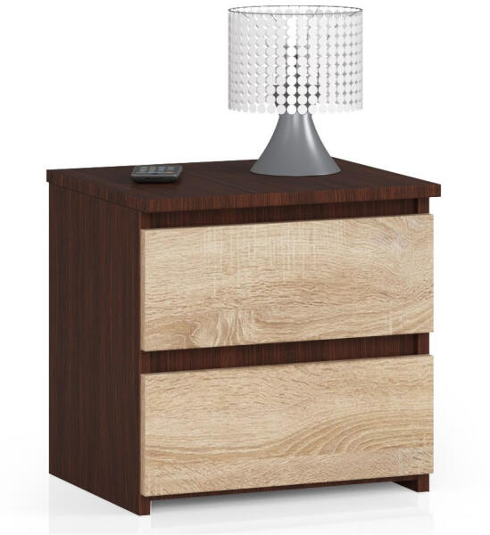 Modern, kompakt éjjeliszekrény két fiókkal, amely tökéletes kombinációja a wenge korpusznak és sonoma tölgy frontoknak. A 16 mm-es laminált lapból készült bútor ABS élzárással rendelkezik a tartósság érdekében. Stílusos és praktikus tárolómegoldás a hálószobábaEz az elegáns éjjeliszekrény tökéletesen ötvözi a funkcionalitást és a design elemeket. A wenge szí