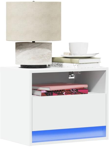Díszítse hálószobáját ezzel a LED-es lámpával felszerelt, falra szerelhető éjjeliszekrénnyel! Könnyedén beleolvad bármilyen stílusú berendezésbe! Stabil és tartós anyag: A szerelt fa tartós és stabil anyag sima felülettel, amely ellenáll a nedvességnek, a vetemedésnek és a hasadásnak, így megbízható választás különféle célokhoz. RGB LED-világítás a kellemes k