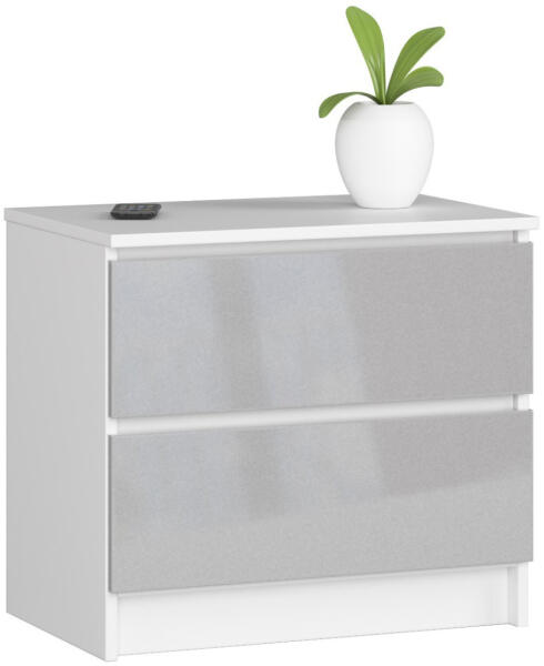 Modern, kompakt komód két tágas fiókkal, fehér korpusszal és metál magasfényű frontokkal. Tökéletes tárolási megoldás hálószobákba vagy nappali terekbe, kiváló minőségű anyagokból készítve. Elegáns tárolási megoldás modern otthonokbaEz a modern vonalvezetésű komód tökéletesen ötvözi a funkcionalitást és az esztétikumot. A fehér matt korpusz és a metál maga