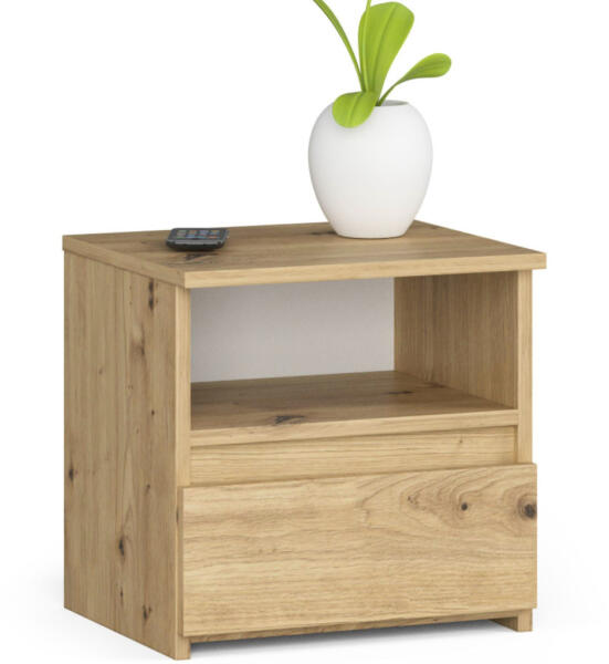 Modern és praktikus éjjeliszekrény egy fiókkal és nyitott polccal, amely tökéletes kiegészítője lehet hálószobájának. Az Artisan tölgy kivitel és a kopásálló laminált lap biztosítja a tartósságot és az elegáns megjelenést. Elegáns és praktikus tárolási megoldás a hálószobábaAz AKORD CL1 éjjeliszekrény tökéletes kombinációja a funkcionalitásnak és a stílus