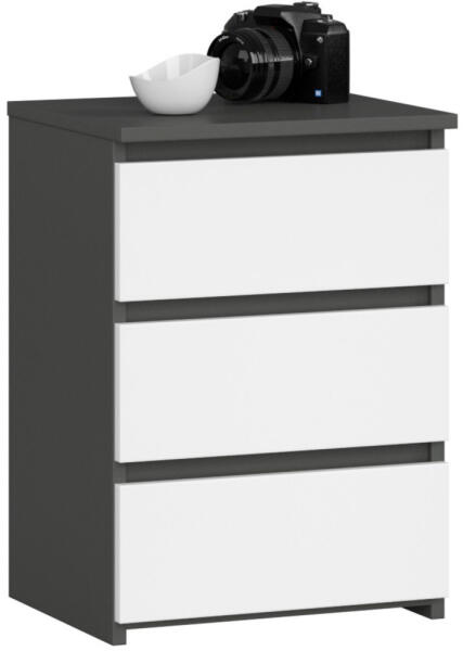 Modern és praktikus éjjeliszekrény három tágas fiókkal, amely tökéletes kombinációja a grafitszürke korpusznak és a matt fehér frontoknak. A 40 cm széles komód kiváló minőségű, kopásálló laminált lapból készült, ABS élzárással a tartósság érdekében. Elegáns tárolási megoldás a hálószobábaAz AKORD CL3 éjjeliszekrény a modern dizájn és a praktikus funkcio