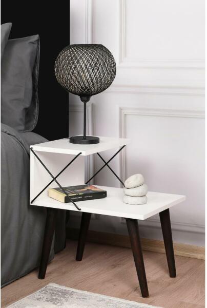 CROSS éjjeliszekrény. Egyszerű, modern stílusának köszönhetően szinte minden hálószobába illik. Két polc, hogy a kívánt dolgokat könnyen elérhető közelségben tartsa. Fehér színben, barna lábakkal és fekete fémmel. Laminált forgácslapból, bükkfa lábakkal készült. Az anyagvastagság: 1,8 cm. Lábak hossza: 31 cm. A felső polc hossza: 25 cm. Az alsó polc hossza: 50 cm