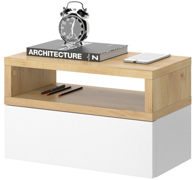 Az Urbano éjjeliszekrény tökéletes társ egy nyugodt éjszakához. Számos funkciójával, mint például a kihúzható fiók és a nyitott polc, elegendő tárolóhelyet kínál mindennek, amire az éjszaka folyamán szüksége van. Az éjjeliszekrény eredeti kialakítása könnyedén beépíthető bármely hálószobába, és akár a falra is akasztható. Színek: fehér / tölgy Méretek: