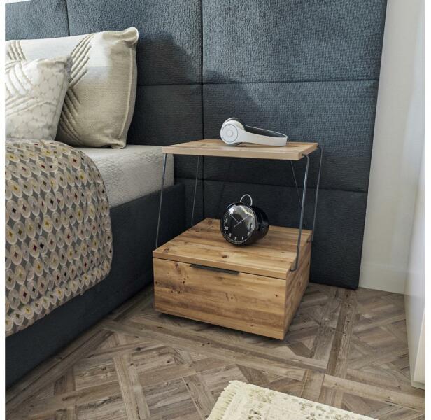 TEKOBA éjjeliszekrény. Egyszerű, modern stílusának köszönhetően szinte minden hálószobába illik. Egy tágas szekrény és egy polc tárolja azokat a dolgokat, amelyeket kéznél szeretne tartani. Barna színű kivitelben. Laminált forgácslapból készült. Az anyagvastagság: 1,8 cm. Metál lábak. Fa mintázata: fenyő.