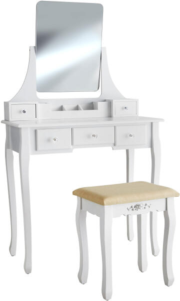 Kezdje stílusosan a napját a modern és elegáns Claire fésülködőasztallal a tectaketől. Egy nagy és forgó tükör előtt minden smink és frizura tökéletes. Öt fiókban és kivehető kozmetikai rekeszben mindig minden eszköz kéznél van, a keféktől és parfümöktől kezdve a körömlakklemosókon át a megfelelő ékszerekig. Az MDF lapokból és fenyőfából készült masszív