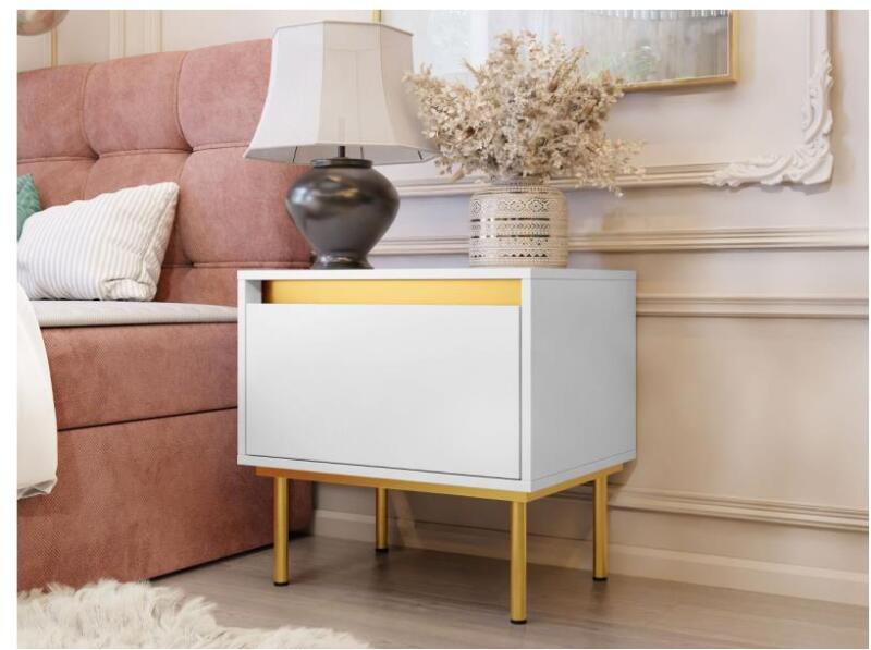 Éjjeliszekrény. Egyszerű, modern stílusával minden otthonba illik. Tágas fiók a kéznél lévő dolgok tárolására. Vastag laminált lemezből készült, 16 mm vastagságban. Fém lábakkal, amelyek magassága 20 cm. Ez a bútordarab szétszedve érkezik.