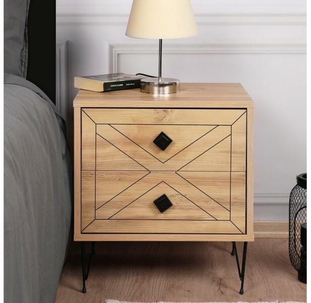 Éjjeliszekrény 2 fiókkal. Az egyszerű, modern stílusnak köszönhetően bármilyen otthonba illik. Fenyőfa színben fényezett. Laminált forgácslapból készült, lábai fémből. Anyagvastagság: 1,8 cm. Az asztal lábainak magassága: 15 cm. Fa mintázata: fenyő.