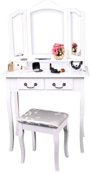 Fésülködőasztal REGINA NEW masszív fából, 4 fiókkal barokk stílusban Szín: fehér/ezüst Méretek: (SzxMaxMé) 80x40x142 cm, zsámoly méretei (SzxMéxMa): 38x28x45 cm Szövet kopásállósága a Martindale teszt szerint: 84 000 ciklus Anyag vastagsága: 15 mm Anyag: MDF/masszív fa/szövet/100%poliészter/fém fogantyúk. Teherbírás asztalnál: 25 kg Teherbírás ülőkénél: 100 kg