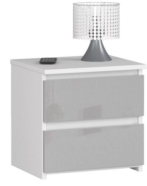 Modern, kompakt éjjeliszekrény két fiókkal, metál magasfényű frontokkal és fehér korpusszal. Kiváló minőségű, 16 mm-es laminált bútorlapból készült, ABS élzárással a tartósság érdekében. Elegáns tárolási megoldás a hálószobábaAz AKORD CL2 éjjeliszekrény tökéletes választás a modern hálószobákba. A 40x40x35 cm-es kompakt méretével ideálisan illeszkedik a