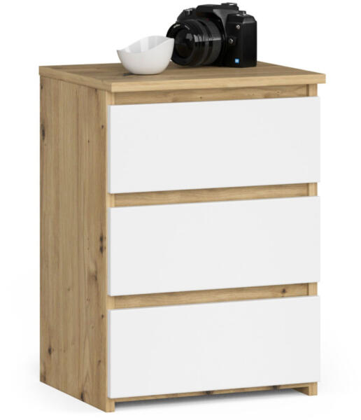 Modern és praktikus éjjeliszekrény három fiókkal, amely tökéletesen ötvözi az artisan tölgy és fehér színvilágot. Kiváló minőségű laminált lapból készült, ABS élzárással a tartósság érdekében. Elegáns és praktikus tárolási megoldás a hálószobábaAz AKORD CL3 éjjeliszekrény tökéletes kombinációja a funkcionalitásnak és a modern designnak. A 40 cm széles
