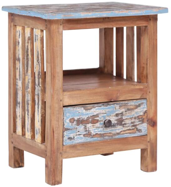 Ez a modern fa éjjeliszekrény otthona időtlen kiegészítője lesz. Univerzális szekrényként a nappaliban is használható kisasztalként. A szekrény tömör újrahasznosított fából készült, melyet kidőlt fákból, fakocsik kerekeiből, hajókból, régi épületek padlóiból, tartógerendáiból vagy deszkáiból állítottak össze, így különböző fatípusok jellegzetességeit