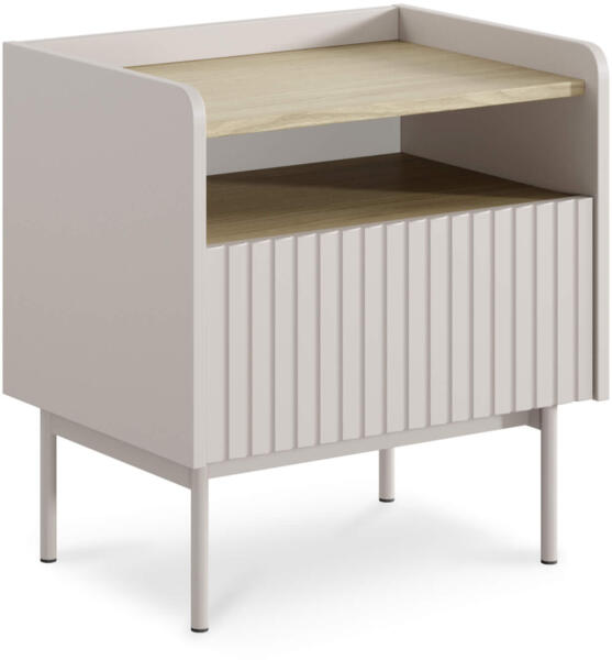 A LEVEL éjjeliszekrény egy fiókkal rendelkezik és egy nyitott polccal. Tökéletes választás azoknak, akik egy modern és praktikus bútordarabot keresnek a hálószobába. Számos helyet biztosít az éppen olvasott könyvnek, a telefonunknak vagy az éjjelilámpának. Vásárolja meg magának ezt a praktikus éjjeliszekrényt. A bézs és a scandi tölgy kombinációja igazán remekül mut