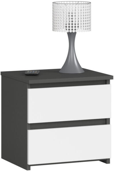Modern, kompakt éjjeliszekrény két fiókkal, amely tökéletes kombinációja a grafitszürke korpusznak és a fehér frontoknak. A 16 mm-es kopásálló laminált lapból készült bútor ideális tárolási megoldást kínál a hálószobába. Elegáns és praktikus tárolás a hálószobábanAz AKORD CLP CL2 éjjeliszekrény a modern hálószobai bútorok tökéletes példája. A grafitszür