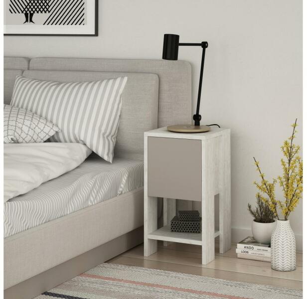 EMA éjjeliszekrény. Egyszerű, modern stílusának köszönhetően bármilyen otthonba illeszkedik. Egy tágas szekrény és egy polc tárolja azokat a dolgokat, amelyeket kéznél szeretne tartani. Fehér és bézs színben kapható. Laminált forgácslapból készült. Az anyag vastagsága: 1,8 cm. A lábak hossza: 8 cm.