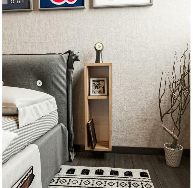 Falra szerelhető éjjeliszekrény. Egyszerű, modern stílusának köszönhetően bármilyen otthonba illik. Két tágas polc a kéznél lévő dolgok tárolására. Barna színösszeállítás. Laminált forgácslapból készült. Az anyagvastagság: 1,8 cm. Fa mintája: fenyő. Terhelhetőség: 5 kg.