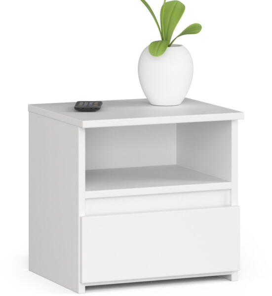 Modern és praktikus fehér éjjeliszekrény egy fiókkal és nyitott polccal, amely tökéletes kiegészítője lehet hálószobájának. Kopásálló laminált lapból készült, ABS élzárással a tartósság érdekében. Elegáns és praktikus tárolási megoldás a hálószobábaAz AKORD CL1 éjjeliszekrény egy modern és sokoldalú bútordarab, amely tökéletesen ötvözi a funkcionalitá