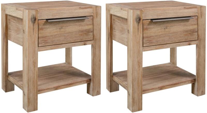 Anyaga: csiszolt felületű tömör akácfa, MDF, akác furnér Mérete: 40 x 30 x 48 cm (Ho x Szé x Ma) A csomag tartalma: 2 db éjjeliszekrény Ez az éjjeliszekrény szett rusztikus bájt csempész otthonába. Az éjjeliszekrény használható végasztalként vagy telefonállványként is. Az ágy melletti asztal tömör akácfából, MDF-ből és akácfa furnérból készült, ami nagyon tart