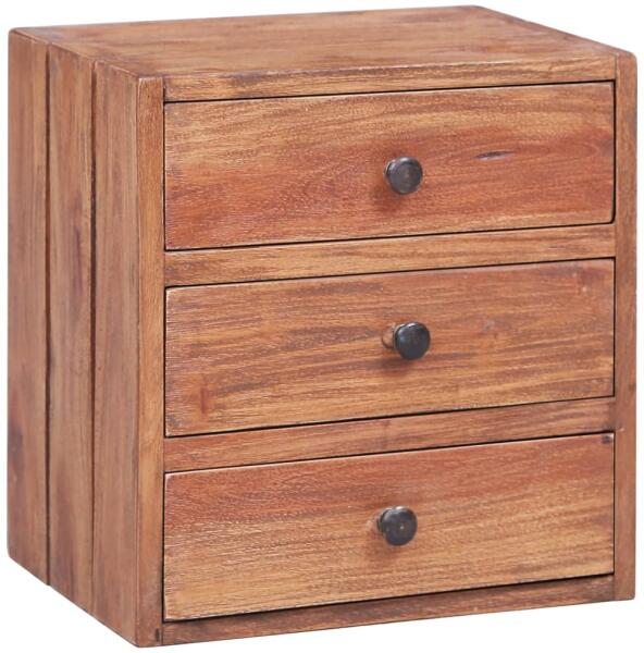 Anyaga: tömör újrahasznosított fa Mérete: 35 x 25 x 35 cm (Szé x Mé x Ma) 3 fiókkal Csempésszen egy csipetnyi rusztikus bájt otthonába ezzel a fa éjjeliszekrénnyel! A három fiókkal ellátott különleges éjjeliszekrény segít tárgyai rendben tartásában. Az antik stílusú éjjeliszekrény tömör újrahasznosított fából készült, melyet kidőlt fákból, fakocsik kerekeibő