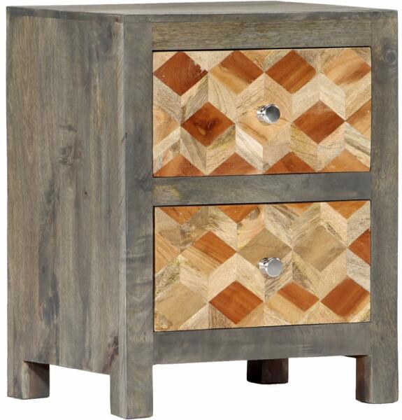 Színe: szürke és barna Anyaga: tömör mangófa, MDF Mérete: 40 x 30 x 50 cm (Ho x Szé x Ma) 2 fiók gyémánt alakú mintával Polírozott, festett, és lakkozott Vigyen egy kis múlt századi luxust otthonába elegáns fa éjjeliszekrényünkkel! A tömör mangófából készült éjjeliszekrény gyönyörű felülkezelést kapott: le lett csiszolva, festve és lakkozva, ennek köszönheti