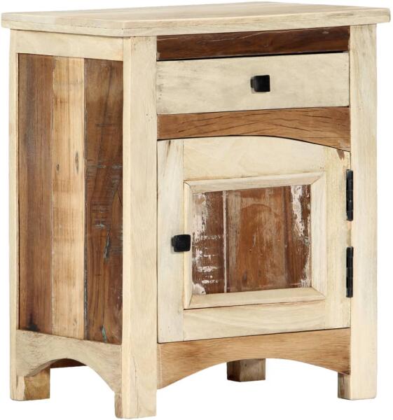 Anyaga: tömör újrahasznosított fa, mangófa, MDF Mérete: 40 x 30 x 50 cm (Szé x Mé x Ma) 1 fiókkal és 1 ajtóval Polírozott és lakkozott Vigye be a századközepi elegancia hangulatát belső terébe gyönyörű, tömör fából készült éjjeliszekrényünkkel! Ez az éjjeliszekrény tömör mangófából és újrahasznosított fából készült, mely korábban gerendaként, padlóké