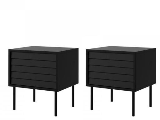 Két éjjeliszekrényből álló készlet. Egyszerű, modern stílusával minden otthonba illik. Tágas polcokon tárolhatja azokat a dolgokat, amelyeket kéznél szeretne tartani. 16 és 18 mm vastag laminált lemezből készült. PUSH TO OPEN nyitórendszerrel. Fém lábak 20 cm magassággal. Terhelhetőség: legfeljebb 10 kg. Ez a bútordarab szétszedve érkezik.