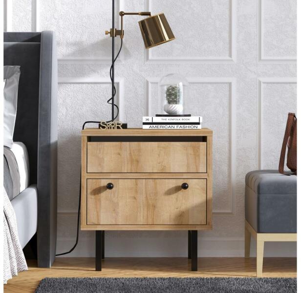 Éjjeliszekrény barna színben. Az egyszerű, modern stílusnak köszönhetően bármilyen otthonba illik. Két tágas fiók a kéznél lévő dolgok tárolásához. Készült laminált forgácslapból, fém lábakkal. Anyagvastagság: 1,8 cm. Lábhossz: 15 cm. Fa mintázata: tölgy.