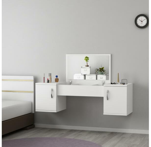 Falra szerelhető öltözőasztal tükörrel. Egyszerű kialakításának köszönhetően bármilyen enteriőrbe illeszkedik. Fehér színű kivitelben. Két oldalsó szekrénnyel és középen egy tárolórekesszel rendelkezik. Laminált forgácslapból készült. Anyagvastagság: 1,8 cm.