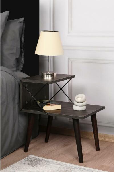 CROSS éjjeliszekrény. Egyszerű, modern stílusának köszönhetően szinte minden hálószobába illik. Két polc a kéznél lévő dolgok tárolásához. Sötét fa színű kivitel, barna lábakkal és fekete fémmel. Laminált forgácslapból készült, bükkfa lábakkal. Az anyagvastagság: 1,8 cm. Lábak hossza: 31 cm. A felső polc hossza: 25 cm. Az alsó polc hossza: 50 cm.