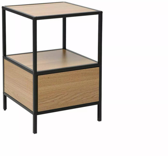 Modern és praktikus éjjeliszekrény laminált tölgy felülettel és matt fekete fémvázzal. A push-to-open rendszerű fiók és a nyitott polc tökéletes kombinációja biztosítja a funkcionalitást és az esztétikus megjelenést. Modern és praktikus éjjeliszekrény push-to-open rendszerrelA Geo S éjjeliszekrény tökéletes kombinációja a modern dizájnnak és a praktikus funkcionalit