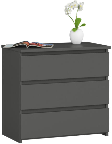 Modern, grafitszürke matt éjjeliszekrény három tágas fiókkal, amely tökéletes tárolási megoldást kínál a hálószobába. A 16 mm-es kopásálló laminált lapból készült bútor ABS élzárással és görgős fémcsúszókkal rendelkezik a tartósság érdekében. Elegáns tárolási megoldás a modern hálószobábaA grafitszürke matt CL3 éjjeliszekrény a funkcionalitás és az
