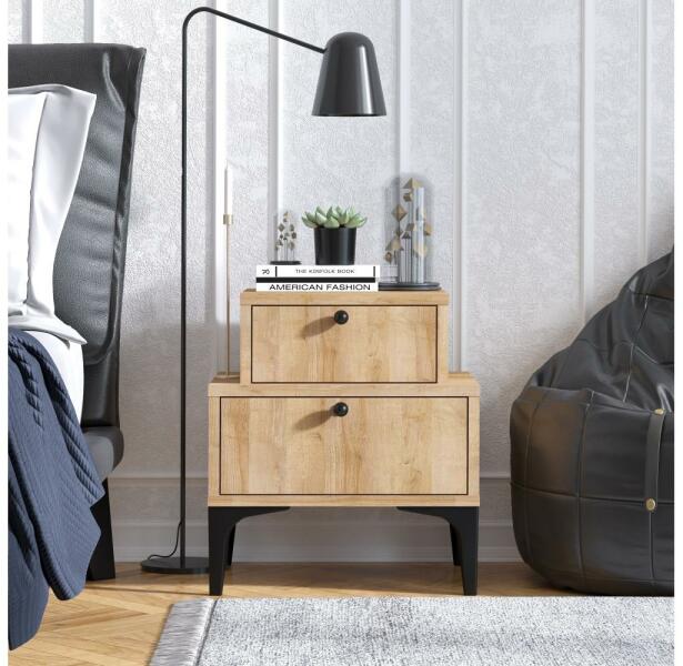 ALBERO éjjeliszekrény. Egyszerű, modern stílusának köszönhetően minden otthonba illik. Két tágas fiókban tárolhatja azokat a dolgokat, amelyeket kéznél szeretne tartani. A fa és a fekete szín kombinációja. Laminált forgácslapból készült, lábai fémből készültek. Az anyagvastagság: 1,8 cm. A lábak magassága: 15 cm. Fa mintázata: tölgy.