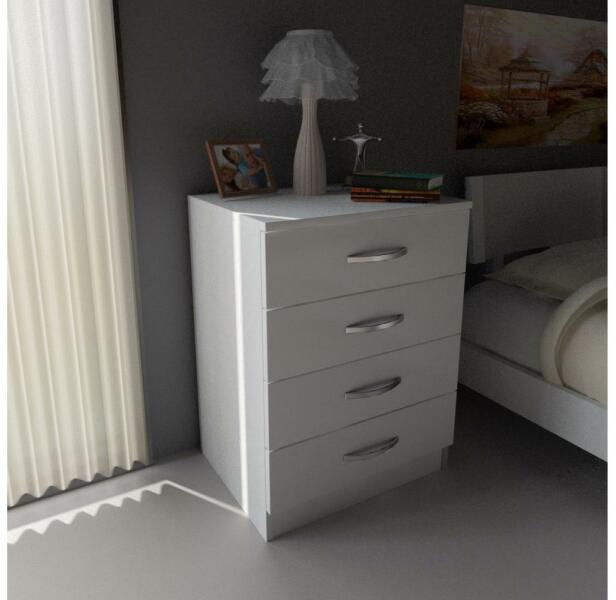 Éjjeliszekrény négy tágas fiókkal. Egyszerű, modern stílusának köszönhetően bármilyen otthonba illik. Laminált forgácslapból készült. Az anyagvastagság: 1,8 cm. Felülete fehér színű.