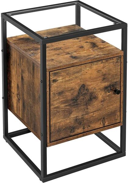 Éjjeli szekrény, Üveg oldalsó asztal szekrénnyel, végasztal, hálószoba, nappali, előszoba, stabil edzett üveg, könnyen összeszerelhető, ipari kivitel, rusztikus barna IDŐTL EN KEDVENC: Egy kis üveggel, fekete vasal és egy kis rusztikus stílussal tényleg nem tévedhetsz. Csak kár lenne, ha ennek az időtlen asztalnak nem adna megfelelő helyet nappalijában vagy hálószobájába