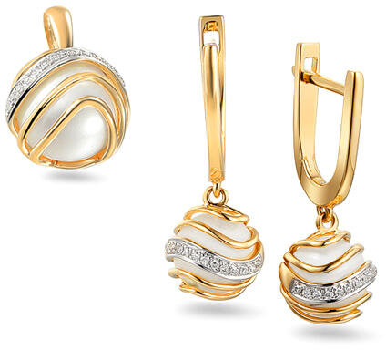 A Chloris szett eredeti gyöngy fülbevalót és medált tartalmaz. A medál finom arany vonalainak ölelésében egy 5 mm átmérőjű fehér édesvízi Biwa gyöngy van elhelyezve, míg a középső részen összesen 15 briliáns csiszolású gyémánt található, amelyek összsúlya 0,030 ct, színük H, tisztaságuk SI1. A Chloris fülbevaló eredeti kialakítása egyedi ékszerré teszi. A f