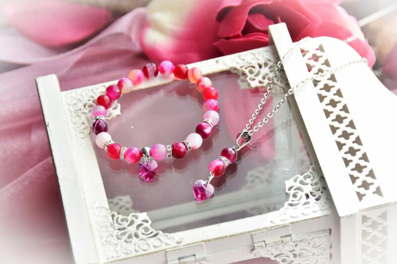 Bordó csillogó szív nyaklánc, karkötő és fülbevaló szett. Paraméterek: Medál / mérete kb. 1,7 cm. Anyaga fémötvözet. Fémrészek anyaga rozsdamentes acél. – Lánc hossza 50 cm. (Ha ettől eltérő méretben szeretnéd, írd be megjegyzésbe!) – Karkötő hossza kb. 17+5 cm. (Ha ettől eltérő méretben szeretnéd, írd be megjegyzésbe!) – A fülbevaló akasztós vagy franci